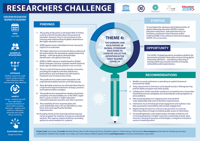The main question of this theme is: Which barriers and facilitators enhance and/or hinder the implementation of GCED during the collective intent of managing COVID-19 through higher education? Additional questions include but are not limited to: