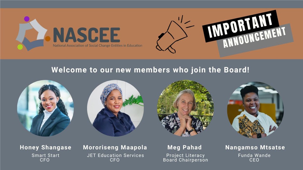 NASCEE welcomed Honey Shangase, Mororiseng Maapola, Meg Pahad and Namgamso Mtsatse as new members joining the Board. They each bring skills and experience which add to the diversity of the Board and will play a valuable role in advancing the mission of NASCEE. Well done to all the new board members.