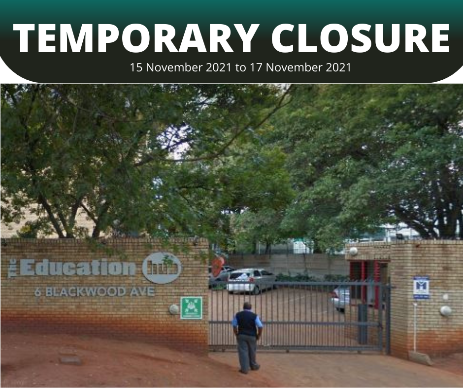 The Education Hub will be closed temporarily due to the Rand Water water outage from Monday (15 November) to Wednesday (17 November). During this time, staff will be working remotely.
