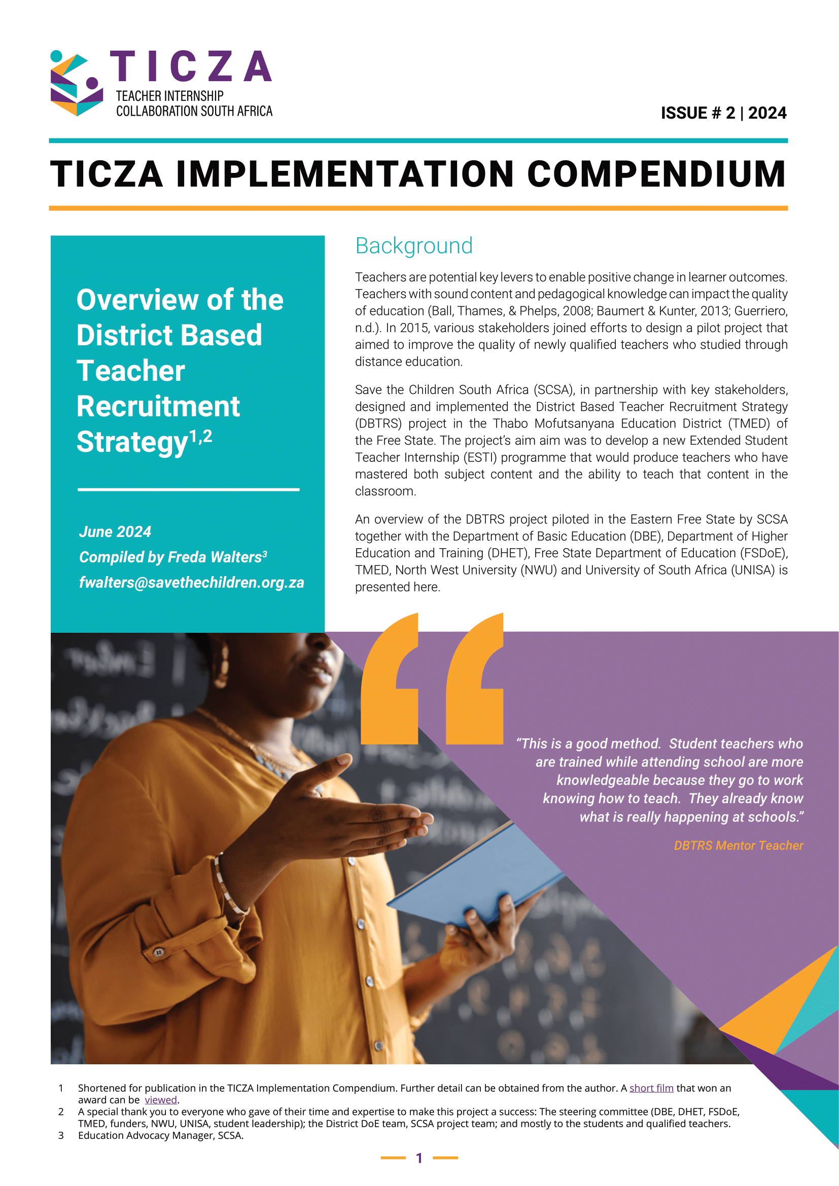 In 2015, various stakeholders joined efforts to design a pilot project that aimed to improve the quality of newly qualified teachers who studied through distance education. Save the Children South Africa (SCSA), in partnership with key stakeholders, designed and implemented the District Based Teacher Recruitment Strategy (DBTRS) project in the Thabo Mofutsanyana Education District (TMED) of the Free State.