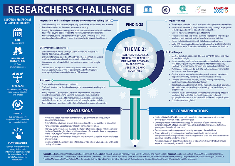 The coronavirus pandemic continues to spread rapidly across the globe with the number of confirmed cases globally surpassing 4 million people as of May 10, 2020. While the pandemic has reached virtually every country in the world, the crisis is only just beginning to unfold in vulnerable developing contexts, including those in Southern Africa. The health and economic effects of the pandemic have been most palpable and responses in these sectors have pre-occupied governments. The immediacy of these health and economic impacts has caused some overshadowing of other more critical impacts of the COVID-19, including the impact on learners and education systems globally. The disruptions to education have been quite dramatic and the serious and detrimental long-term effects are still not fully known. As at May 10, 2020, UNESCO estimates show that COVID-19 has affected some 1,268,164,088 learners (i.e. 72.4% of total enrolled learners globally), with 177 countrywide school closures. Of this total, almost 62 million account for the learners affected in the SADC region.